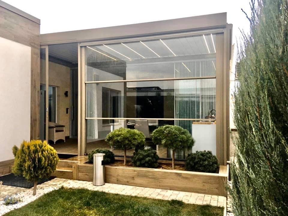 - Скляні панелі системи GILIOTINA пересуваються у вертикальній площині за допомогою вбудованого електропривода. Керування пересуванням стулок відбувається з пульта дистанційного керування. Псприянням стулок може здійснюватися як окремо однієї конструкції, так і до п'яти одночасно.